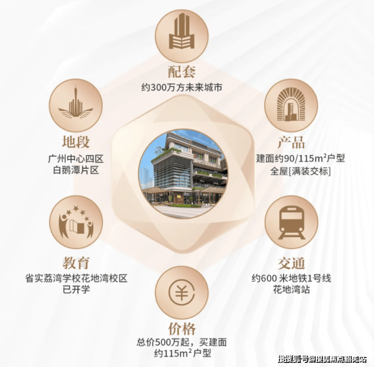 • 地段:距地铁1号线花地湾站仅500米,未来15条轨道将交汇于此。