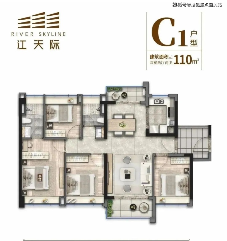 建面约110㎡四房,四开间朝南,双阳台设计,打开阳台门即可享受到江风流淌而过。