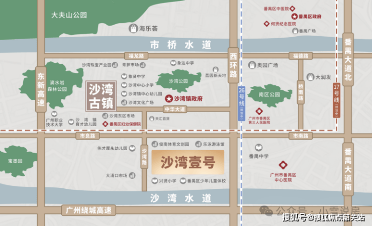 地铁:项目附近规划有地铁 17 号线(远期规划)和 26 号线(沙湾站,预计 2029 年开通)将提升跨区通勤效率,未来从沙湾站出发,40 分钟可直达珠江新城。