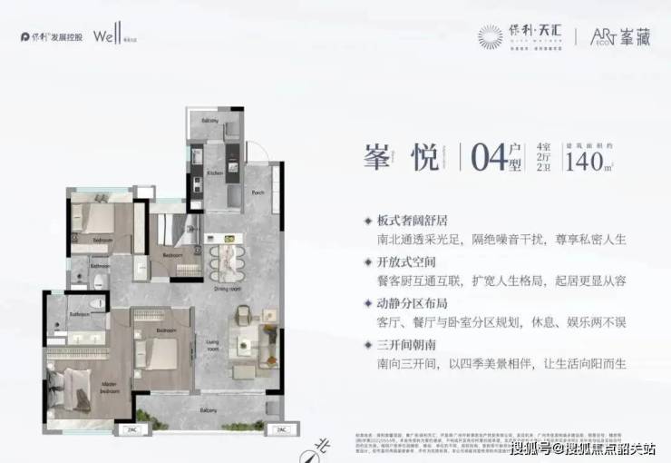 保利天汇的140平米四房户型设计非常宽敞舒适,南北对流户型使得采光和通风效果更佳,南向三开间保证了充足的采光和视野。餐客厅一体化设计增加了空间感和实用性。