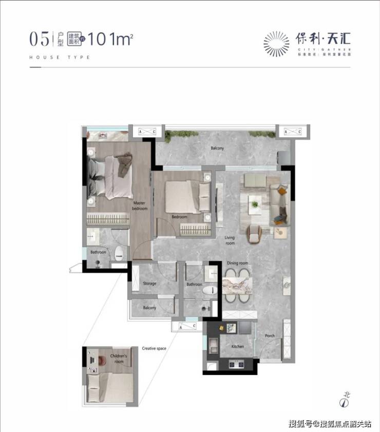 保利天汇项目目前在售的一款建面约101平方米的三房户型,采用经典竖厅设计,有效实现了起居空间与休息区域的动静分离。这一设计不仅优化了居住动线,也保证了家庭成员在日常生活中的私密性及舒适度。