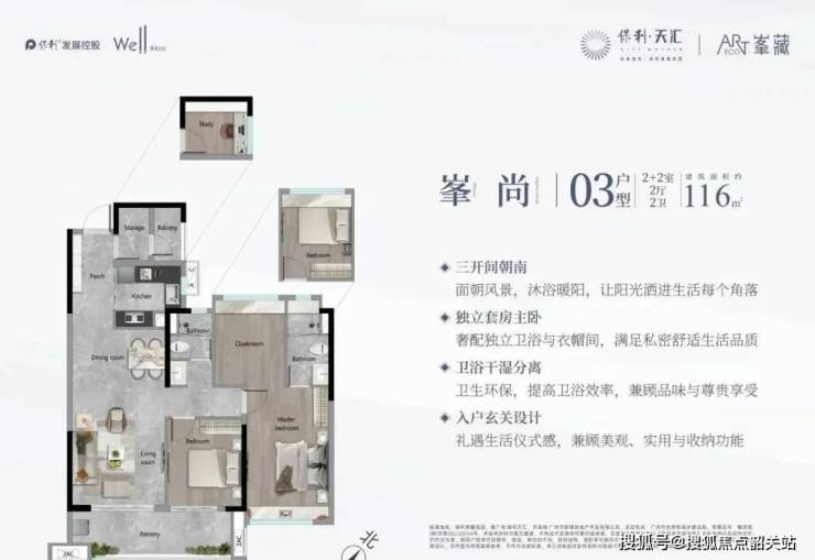保利天汇项目中还有一款建筑面积约116平方米的四房户型,该户型设计亮点颇多。首先,三开间朝南布局,确保了主卧、次卧以及客厅能够享受到充足的自然采光和良好的通风效果,同时提供有南向和东向两种不同的朝向选择,以满足不同购房者对景观和日照的需求。