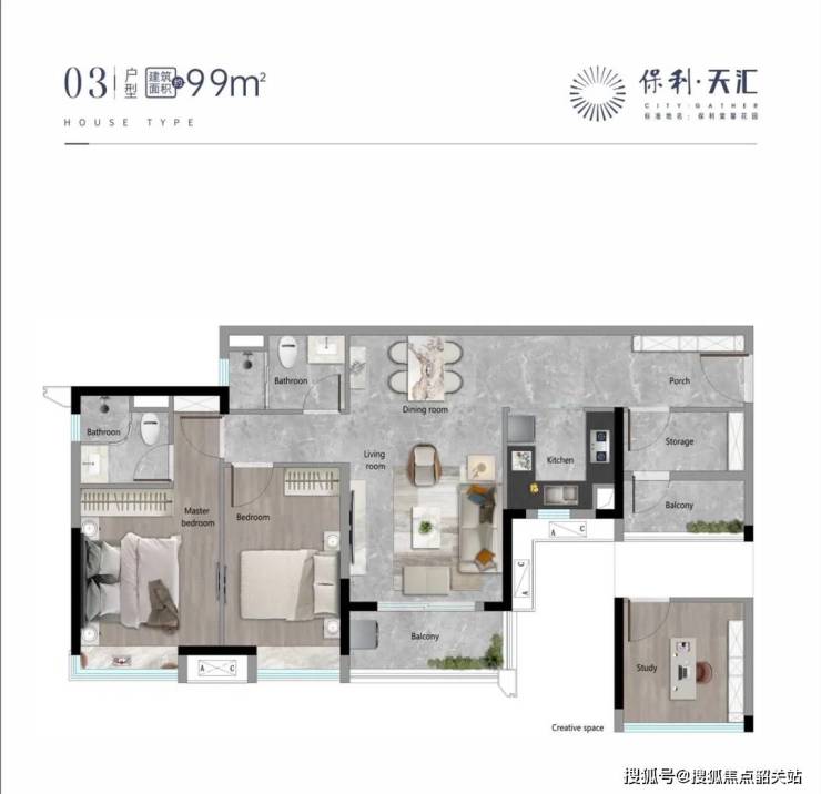 保利天汇的99平米三房户型设计非常实用,一进门就能看到书房,给人一种开阔和舒适的感觉。此外,该户型的赠送面积较大,可以增加实际使用面积,进一步提高空间感和实用性。主卧是套房设计,带有独立卫生间和衣帽间,保证了主人的私密性和舒适度。