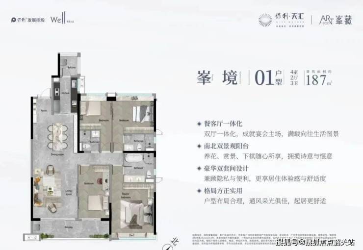 保利天汇的187平米四房户型设计非常宽敞豪华,空间利用合理,能够满足家庭成员的不同需求。该户型带有独立的餐厅和客厅,并且南北通透,保证了充足的采光和通风。此外,主卧套房设计,带有独立卫生间和衣帽间,保证了主人的私密性和舒适度。