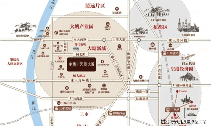 金地艺境天成位于佛山三水区大塘镇政府旁,地处三水北部新城核心,是广佛同城 “花都 - 三水” 第三示范区中心,处于广佛肇清四城交汇核心地带,纳入广佛同城一小时都市圈范围。区域为不限购板块,承接广佛肇清四城居住与产业外溢需求,具备明确的区域发展定位。