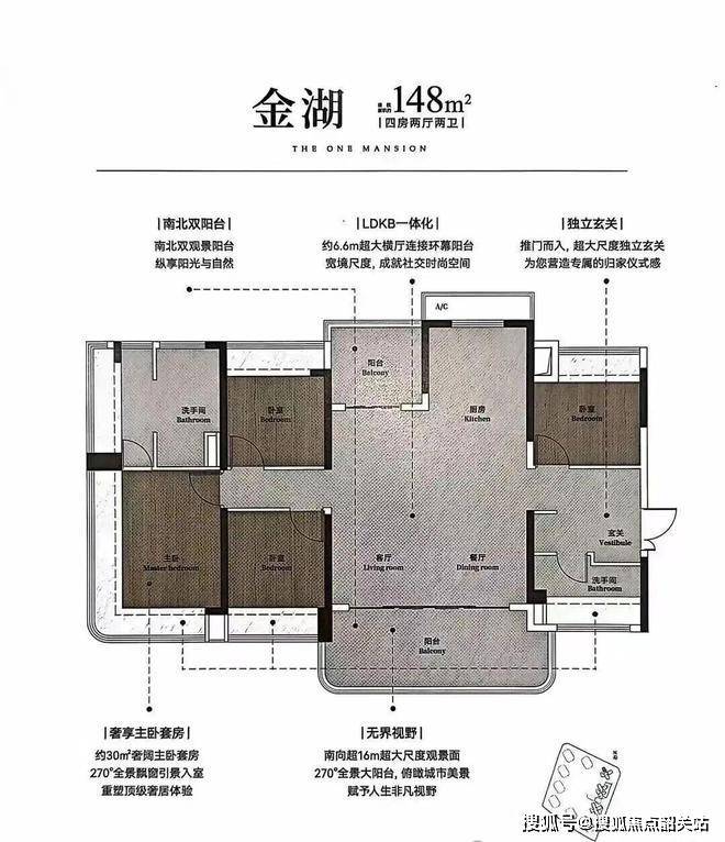 在户型设计上,敏捷万博金湖壹号同样体现出产品力的升级。项目主推98-148㎡的四房户型,空间利用率超过100%,通过LDKB一体化布局、270°全景飘窗、独立玄关等设计细节,实现居住功能的最大化。98㎡户型可以容纳四房,满足三代同堂需求;116㎡户型具备南北对流和入户花园设计,增强居住舒适性与私密性;148㎡户型则拥有16米超长观景面,270°全景阳台让湖景融入室内空间,打造居家观景体验。通过弧形转角、双大堂设计(地上大堂高约5米,地下大堂采用“星空顶”装饰),敏捷万博金湖壹号不仅提升了归家仪式感,也让居住环境更加温馨和有格调。这类设计思路与广州其他高端项目如珑曜上城在使用率优化方面有异曲同工之妙,但在细节与景观整合上更具优势。