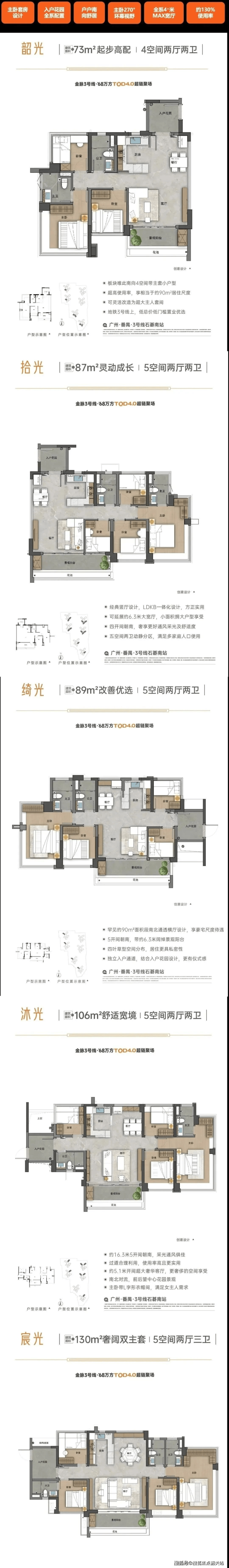 广州地铁地产·珑曜上城首推1栋和2栋,共32层高,两梯五户的设计。主力户型包括73平方米、87-89平方米、109平方米以及130平方米的四到五房单位。所有户型均采用130%超高使用率设计,阳台占比达20%,全南向布局,并标配入户花园和270°环幕飘窗,确保每户充足的日照和通风条件。