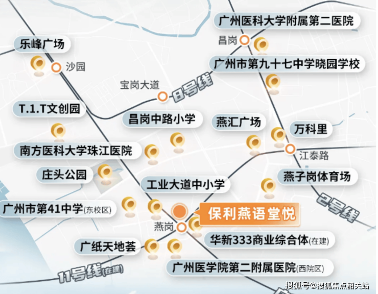 项目紧邻工业大道,配套成熟度在海珠西属于头部梯队。随着地铁11号线即将落成,片区城市界面正加速提升,保利燕语堂悦作为片区内规模体量更完整的新盘,对未来区域居住体验、教育资源优化、人口结构提升都有积极的推动价值。同时,项目配建的24班小学落地高质量教育集团,为片区注入了稳健的教育驱动力。