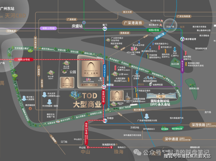 同时,广州地铁18号线正在推进南延与北延工程,南延线将延伸至中山、珠海等大湾区西岸城市,未来将实现从项目直达中山、珠海,北延线将延伸至广州东站、白云城市中心、白云机场,未来将实现从项目直达广州火车站、白云机场,构建起串联广州全域、覆盖大湾区西岸的核心交通动脉。而能建·湾区金融城作为18号线核心站点的地铁口物业,将直接承接线路延伸带来的人口红利、通勤红利与价值辐射,未来无论是广州全域通勤,还是大湾区城际出行,都将拥有无可比拟的便捷性。