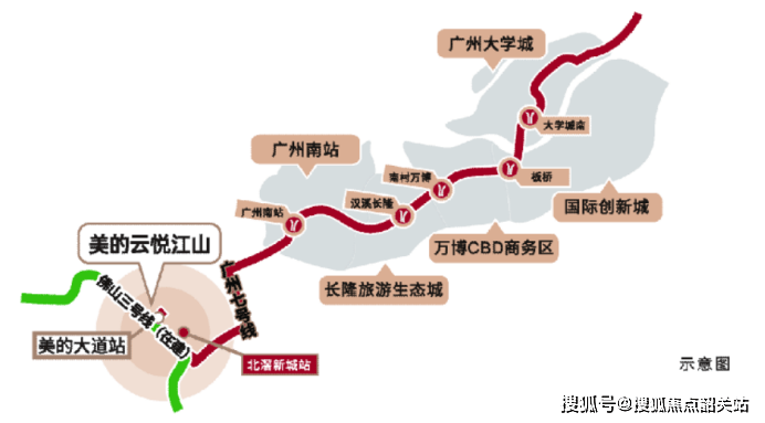 美的云悦江山的区位优势明显,作为广佛枢纽板块的重要节点,交通便利性极高。项目距离广州地铁7号线美的大道站约600米,同时近邻佛山地铁3号线,未来将进一步缩短广佛一体化通勤时间。区域内拥有多条主干道,包括美的大道、105国道、横五路及广佛江珠高速,驾车可快速到达广州主城区和顺德各主要片区。此外,广佛环线、广珠城轨及佛山城际云轨为项目提供立体化轨道交通网络,实现城市间与区域内的高效联动,极大提升通勤便利性和生活效率,为人才工作与居住提供强大支撑。