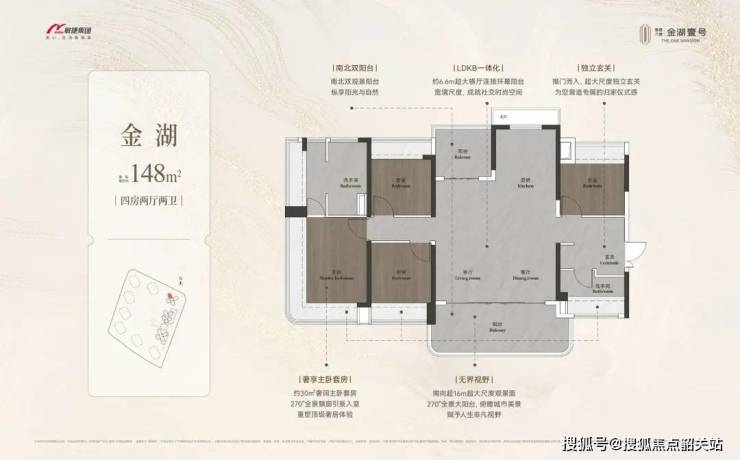 依托最新住宅设计规范,打造全南向高拓展户型,主力产品为98-148㎡全四房,使用率高达110%,同等面积可多出一间房,空间利用率显著优于同板块竞品。各户型均采用LDKB一体化设计,搭配大尺度景观阳台与环幕飘窗,最大化提升空间通透感与观景效果。
