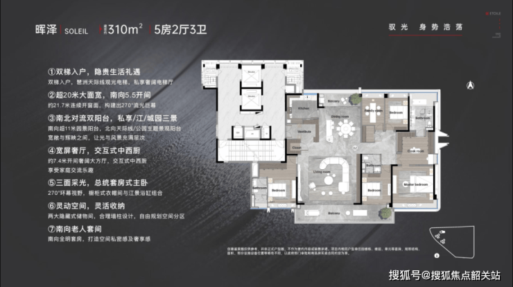 :拥有超过20米的南向大面宽,配备11.8米宽景阳台,窗地比高达38%,带来了270°流光巨幕体验。