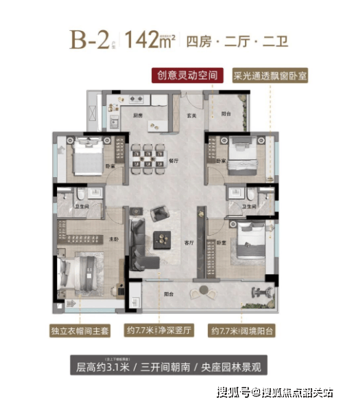 2. 布局设计:采用横厅设计,客厅面宽约7.5米,进深约4.8米,空间开阔,采光通风极佳,客厅与餐厅相连,形成超大活动空间,可满足家庭聚会、儿童玩耍等需求;厨房采用L型设计,操作动线合理,配备国际品牌厨具,同时预留冰箱位置,实用性强;主卧朝南,带独立卫生间与衣帽间,私密性强,主卧面宽约3.9米,进深约5.8米,配备全景飘窗,视野开阔,可欣赏南向山景;三个次卧中,两个朝南、一个朝北,面宽分别约3.3米、3.1米、2.9米,进深均约4.2米,空间宽敞,可作为儿童房、书房、客房,灵活使用;公共卫生间采用干湿分离设计,配备淋浴、马桶、洗手台等,使用便捷。