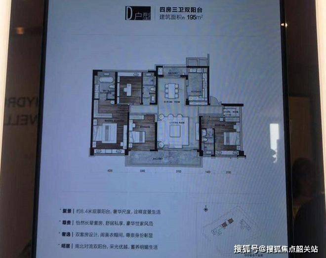 建面195㎡四房三卫双阳台户型图,观景阳台去到约8.4米,此外还有两个套房设计,真的是有钱就可以任性呀~