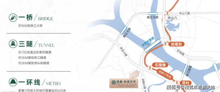 建鑫如意芳华扎在白鹅潭核心区,离在建的地铁11号线石围塘站只有600米,这条大环线贯通天河、琶洲