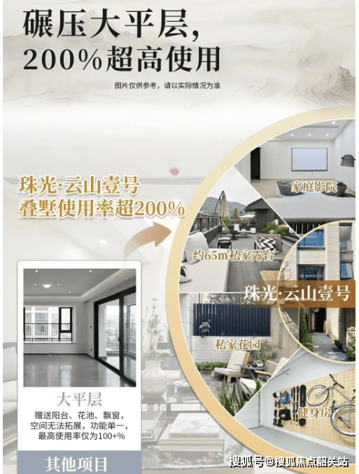 尤其大平层,费尽心思,通过阳台、花池、飘窗等边角位置,提高赠送率;实际得房率从80%,升级至100+%,但赠送空间无法拓展,实际居住,体感欠佳。可见,即便苦心钻研,大平层仍停留在“送两成”这样的空间思考;与此不同的是,作为城央罕见的云山墅,珠光·云山壹号以顶豪姿态精研产品,直接实现“200+%实用”的创举。