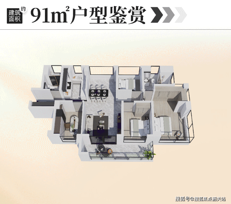 91㎡四房:尺度感直逼120㎡大户型,配备约6.3米南向景观阳台,横跨客厅与主卧,可打造第二客厅、茶室或健身区;主卧引入270°环幕全景窗,视野开阔,尽揽白鹅潭繁华天际线。