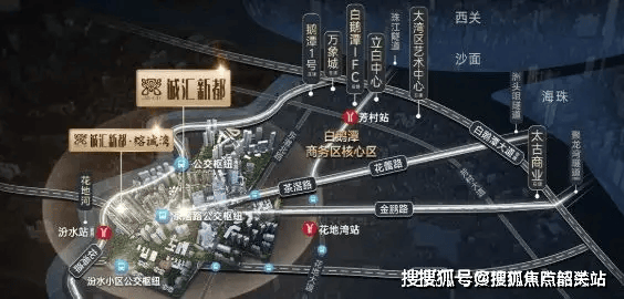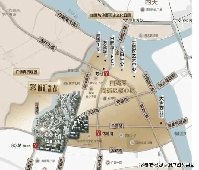 榕城湾位于荔湾花地湾核心区,直线距离珠江约600米,东临白鹅潭CBD,西接佛山千灯湖金融高新区。根据《广佛同城化发展规划(2025-2035)》,花地湾将被打造为“广佛创新服务轴”的核心节点。