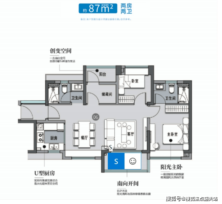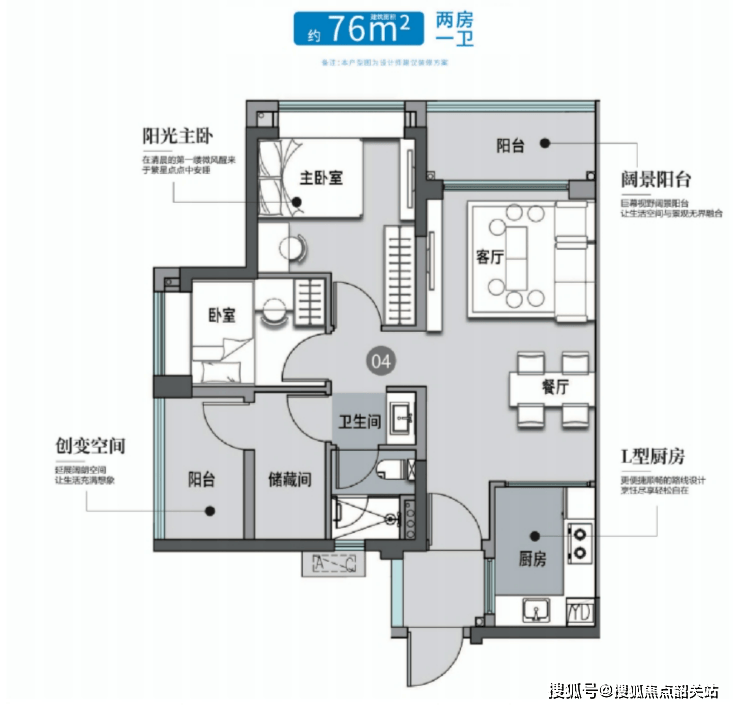 76㎡两厅2+1房:带入户花园+横厅设计,百变空间可改第三卧室,适合年轻家庭或小三口;