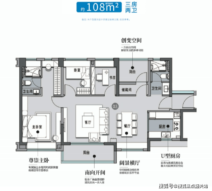 108㎡两厅3+1房:横厅+独立阳光衣帽间,主卧升级南北对流,自成私密“小家”,全家通风采光极佳。