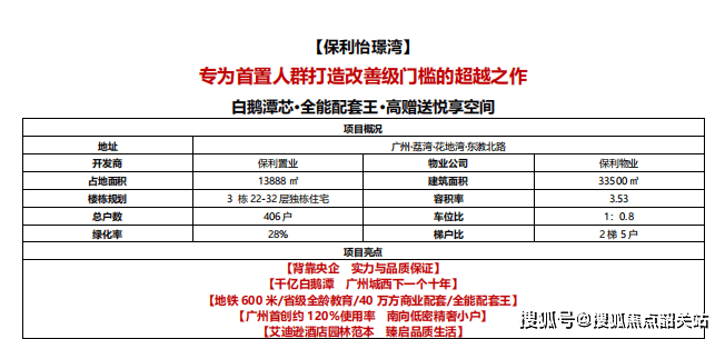 保利怡璟湾由央企保利打造,落子荔湾“门户”花地湾板块,紧邻地铁1号线坑口站,占据老荔湾与新荔湾交汇地带,片区发展潜力稳步兑现。项目总建面约3.35万㎡,共规划3栋南向高层住宅和1栋商业办公楼,整体定位明确,主打首置+改善人群,是当前板块内容积率最低的高品质住宅社区。
