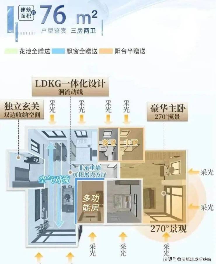 建面约76㎡ 三房两卫:独立玄关入户,LDKG一体化设计,动静分离,南北通透。