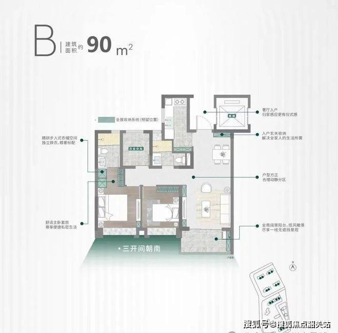 户型设计各有亮点。建面约 90㎡三房二卫户型位于每栋楼中间位置,两户共用双开门电梯,三开间朝南,两间南向房间空间充足,主卧带主套及衣帽间,满足新婚家庭需求,价格相对亲民。建面约 100㎡三房二卫户型处于每栋楼两侧单边位,进深远大于开间,呈竖向长方形,二开间朝南,主卧隐私性好,客餐厅空间感优异,使用率超 9 成。建面约 110㎡四房二卫户型位于每栋楼单边最好位置,入户赠送电梯间最大,三开间朝南。虽未明确提及得房率,但从户型设计和电梯间赠送来看,空间利用较为合理,居住舒适度较高。