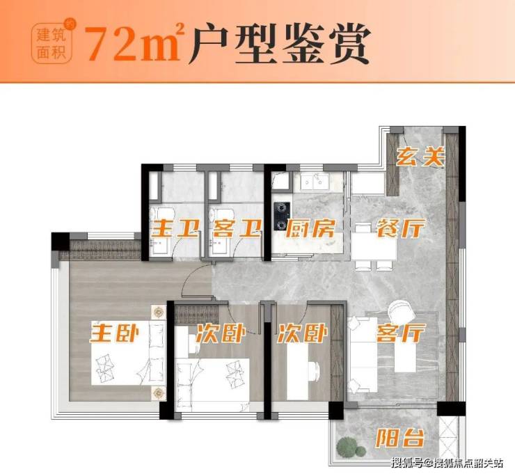 72㎡三房户型:虽然是入门级户型,但设计紧凑合理,做到了南向三房,实际使用感受不输上一代90㎡户型。