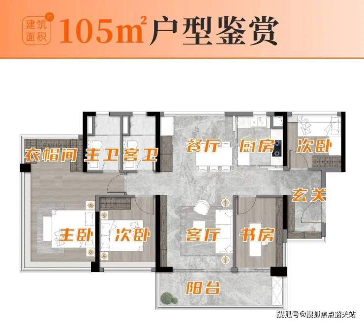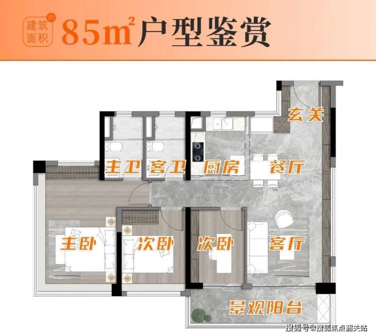 85㎡四房户型:升级版户型,阳台长达6米并连通书房,可灵活改造为超级大方厅。