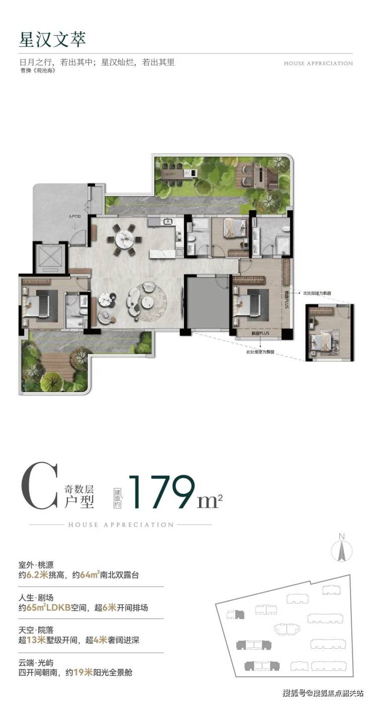 项目提供约146-288㎡的四代宅大平层,每户标配超6.2米挑高、超4米进深的天空院,以及奇偶错层设计,突破传统采光局限。所有户型均采用2T2户或3T2户设计,保证户户朝南,实现最佳通风和采光效果。270°环幕视界更能让您尽揽江、园、城、院四维风光。