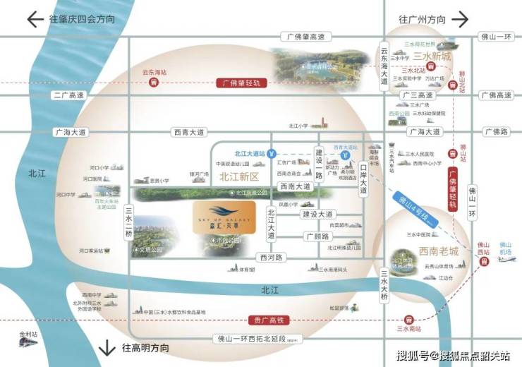 项目周边拥有完善的交通网络,包括地铁4号线(在建)北江大道站和广佛肇城际轻轨云东海站/三水北站。驾车出行同样方便快捷,通过西南大道和北江大道可以快速到达全城。商业配套方面,家门口就有银河广场、汇信广场、新动力广场等三大商场,满足日常生活所需。