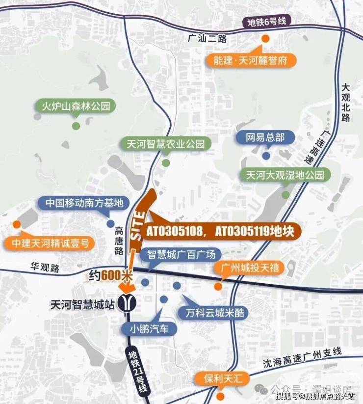 项目坐落于广州天河区天河智慧城核心板块,地处广州第三中轴“活力创新轴”的核心发展区段,是天河区近年重点打造的科创产业与宜居生活融合板块。天河区作为广州的经济、金融、科创核心,2025年GDP总量持续领跑全市,汇聚了全市超70%的高新技术企业、超60%的科创人才,而天河智慧城作为天河科创产业的核心承载地,已入驻企业超2500家,其中包含超300家高新技术企业、超50家总部型企业,形成了以人工智能、数字经济、软件信息为主导的产业集群,稳定的产业基础为板块居住价值提供了坚实支撑。项目所处的AT0305108、AT0305119地块,是天河智慧城核心区内少有的住宅用地,2024年11月由珠江实业联合体以32.5亿元总价竞得,折合楼面价约2.81万元/㎡,是板块内近3年少有的大规模住宅用地供应。项目北临高唐路,南接华观路,处于天河智慧城政务、商业、产业三大功能区的交汇位置,既承接了珠江新城、金融城、琶洲三大核心CBD的外溢居住需求,又享受了科创板块的发展红利,周边3公里范围内覆盖了天河智慧城政务服务中心、天河人才港等核心公共服务配套,是天河区内兼具成熟度与成长性的居住板块。相较于天河区其他板块,项目所在区域既规避了老城区的界面老旧、配套更新缓慢的问题,又避免了远郊板块配套缺失、发展周期长的短板,在产业、交通、配套的多重加持下,形成了独立且完善的居住生态圈,在广州城市东进的发展脉络中,占据了核心的价值节点。