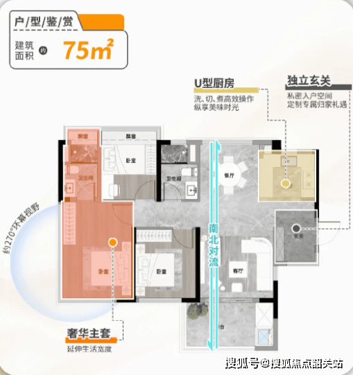 信达繁花里主推75㎡、94㎡、108㎡三种户型,均为高使用率设计。75㎡户型可实现三房两厅两卫布局,入口玄关可改造为储物空间,U型厨房设计操作动线合理,南北通透保证良好采光与通风,非常适合刚需小家庭。