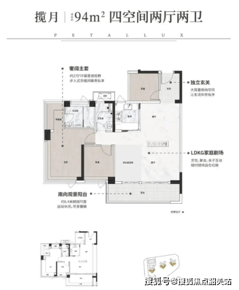 94㎡户型为四房两厅两卫,LDK一体化设计让餐客厅和厨房连通,空间开阔,约6.4米超大阳台兼具晾晒与休闲功能,主卧配全景飘窗,提升居住舒适度,适合二胎或多人口家庭。