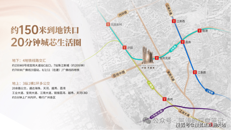 交通路网方面,项目周边形成“三纵三横”立体交通体系。纵向主干道包括宝岗大道、工业大道、江南大道,横向连接昌岗路、新港路、滨江路。驾车出行,通过昌岗立交可快速接入内环路,向东15分钟可达琶洲会展中心,向西10分钟抵达荔湾陈家祠,向北经人民桥8分钟进入越秀区,向南通过广州环城高速可通达番禺、南沙。公共交通配置更为密集,项目距离地铁8号线宝岗大道站C出口直线距离约150米,步行时间约2分钟。8号线串联荔湾、海珠、白云三区,可与2号线、3号线、4号线、广佛线实现换乘。实测数据显示,从项目出发,乘坐8号线6站可达陈家祠,4站可达海珠广场,7站可达珠江新城。此外,项目楼下设有宝岗大道公交站,汇集29路、53路、59路、91路、121路、226路、244路、250路、270路、273路等20条公交线路,覆盖广州主要城区。