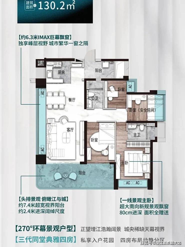 总价195万起,纯南向设计,四开间朝南搭配270°环幕景观,视野无遮挡。主卧飘窗进深达80cm,可坐可观可卧,保障居住私密性与舒适度;10.4米跑道级阳台贯穿客厅与次卧,巨幕江景直入室内,极致拓展观景体验。四个房间空间均衡,可满足三代同堂或二孩家庭的居住需求,一步到位解决换房烦恼。