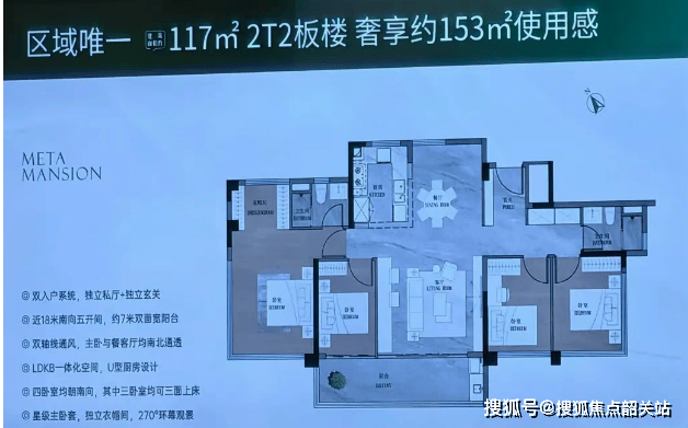 建面约117㎡ 四房两厅二卫:堪称“王炸”户型,专梯专户设计,搭配12 - 13F洋房,私密性和尊贵感十足;约17.5米南向巨幅面宽,五开间朝南,南北通透,超高得房率,奢享大平层的使用感。