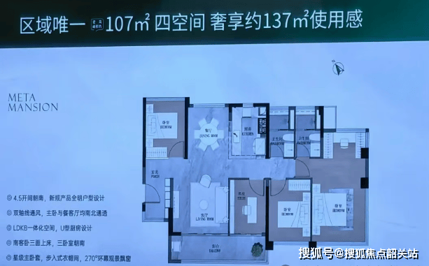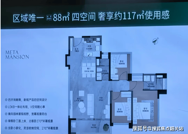 建面约88㎡ 四房两厅二卫:四空间设计,在中轴区域,小户型产品本就稀缺,而这款87㎡的新规户型更是将空间利用做到了极致。约5.2米开间客厅,LDKB一体化布局,约11.6米南向尺度,四开间朝南,搭配宽幕观景阳台,实现小户型的“大享受”。