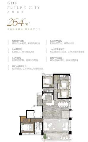 粤海·云港城提供了多种户型选择,包括建面约140-264平方米的现代美学大宅以及建面约129-148平方米的都芯轻奢私邸。所有户型均采用了公建化外立面设计,拥有270°IMAX环幕观景视野,超20米连续采光面,户户均配有大尺度面宽阳台,地上地下双落客大堂设计,呈现出星级酒店式的奢华感。