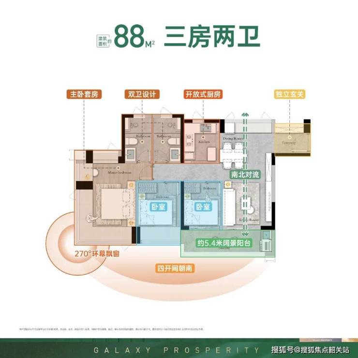 ◎ 三面采光,四开间朝南;主卧270度环幕飘窗,约5.4米阔景阳台,一体化大宽厅,开放式厨房