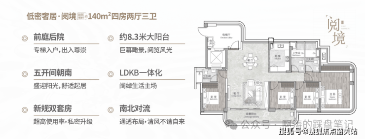 项目建面约 138㎡的四房两厅三卫户型,以极致的空间设计,实现超高使用率,全面满足改善家庭的居住需求。该户型具备六大核心优势,一是专梯入户设计,配备独立入户前厅,实现前庭后院的居住体验,出入尽显尊崇;二是五开间朝南布局,整体南向面宽超 15 米,室内采光充足,盛迎阳光与清风入户;三是新规双套房设计,双主卧均配备独立卫生间与衣帽间,保障家庭成员的居住私密性;四是约 8.3 米南向宽景大阳台,实现巨幕观景视野,推窗即可揽阅花都湖与社区园林双重景观;五是 LDKB 一体化设计,客厅、餐厅、厨房、阳台一体化贯通,打造阔绰的生活主场;六是全南北对流布局,室内空气循环通畅,实现四季通透的舒适居住体验。