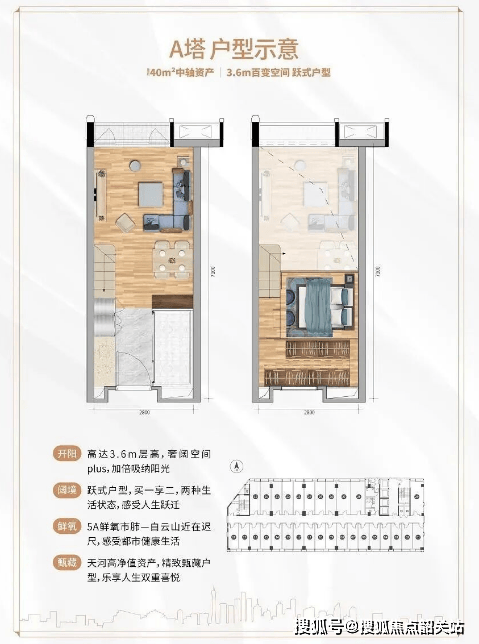 项目规划三大创变产品,约 31㎡能量舱适配城市精英自住需求,约 45㎡梦想 + 打造全能生活空间,约 57㎡云端墅呈现城央墅级居住体验;同时推出双栖产品体系,36-43㎡行政公馆约 3.6 米层高,配星级酒店标准精装,31-54㎡中轴精品约 3.4 米灵动 LOFT,支持居住、办公、投资三大场景灵活转换,标配 U 型厨房与步入式衣帽间,精装细节彰显品质,无论是单身自住、小家庭居住还是创业办公、资产收租,都能完美适配。