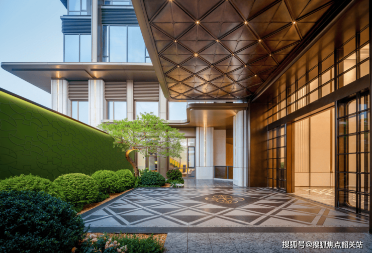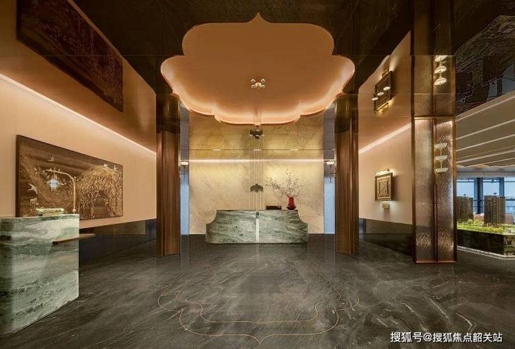 入口处下沉式大堂,金色格栅与水刀拼花地面相映成趣;
