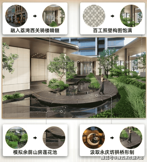 主入口处,一座以“广府端砚”为灵感打造的玉砚迎宾广场赫然眼前。超大尺度的港湾式落客空间配合超高挑空门厅,气派非凡。迎客锦池波光粼粼,寓意着“青云得路、宏图大展”,让每一次归家都充满仪式感。漫步社区,满洲窗的菱形纹样、趟栊门的经典造型随处可见,这些承载街坊记忆的广府元素,在现代园林中焕发出新的生机。