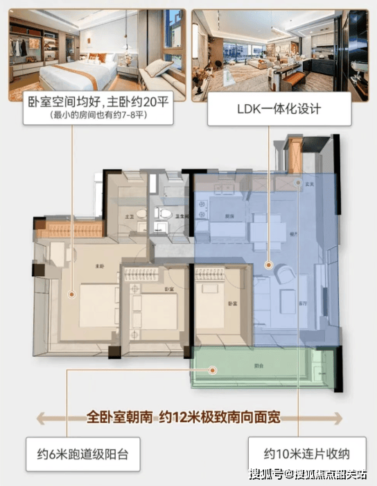 建面约82㎡的三房两厅两卫户型,堪称空间利用的典范。所有卧室均朝南布置,南面是宽敞的客厅与卧室,北面则是双卫与厨房。三个南向卧室确保了极佳的采光与通风,搭配入户花园、双开间大阳台以及LDK(客餐厨)一体化公区,让小户型也能拥有大宅的通透感。主卧卫浴采用干湿分离设计,细节之处尽显人性化关怀。