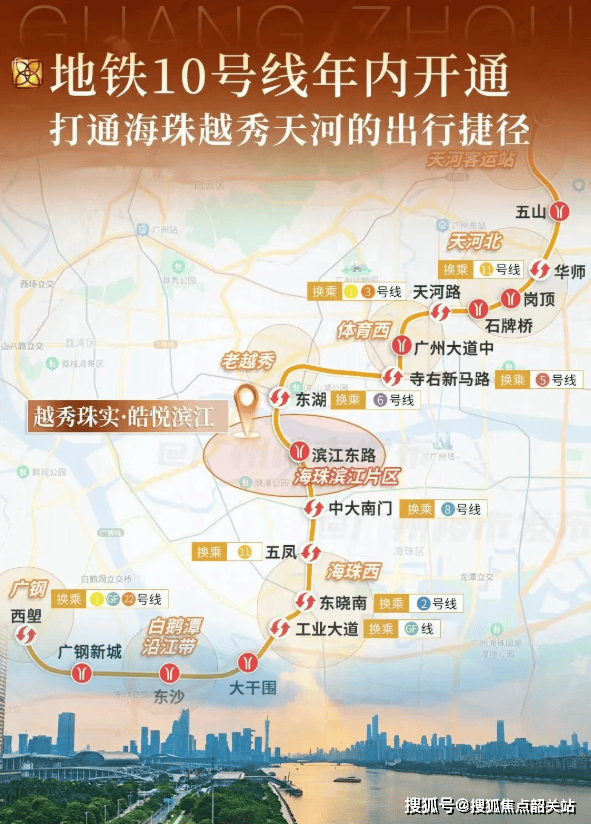A:项目自驾条件优越,通过江湾大桥可直连越秀区,瞬达天河核心区。地铁方面,虽然目前距离最近的2号线市二宫站约1.2公里,但未来东侧在建的10号线滨江东站将极大改善公共交通出行。建成后,可实现1站直达东湖,2站到达五羊邨,3站抵达广州大道中,通勤效率将大幅提升。