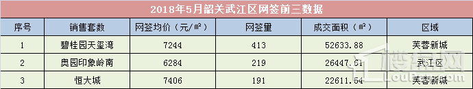 韶关5月区域楼盘销量榜中,武江区销量最多的依旧是芙蓉新区,其中碧桂园天玺湾、奥园印象岭南、韶关恒大城网销均位于区域销售榜前三;其中碧桂园天玺湾网签413套,排名排名前列;奥园文化旅游城韶关印象岭南网签219套,排名第二;韶关恒大城网签191套,排名第三。