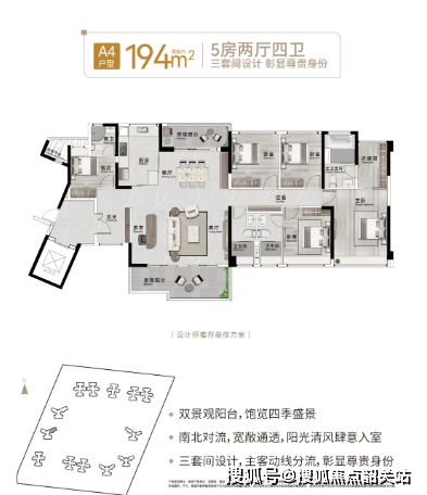 约 194㎡5 房 2 厅 4 卫(3 套间):独立电梯厅,专梯入户,约 21 米南向五开间。南北双景观阳台,通风采光极佳。主卧为奢华套房,带独立阳光衣帽间,尽显尊贵品质。