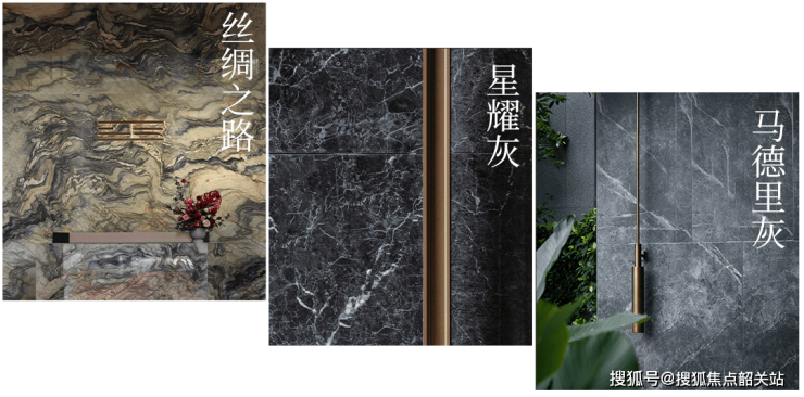 归家大门是招商华玺的第一张名片,长约66米、高逾8米的“公建级”尺度,在广佛地区实属罕见。这不仅是一个物理空间的入口,更是家族荣光与城市共生的不朽封面。出场即王者,这座大门以隐奢风格著称,却又不失大气磅礴。设计师大胆地将本应用于室内点睛的珍稀奢石,以泼墨手笔大面积铺装在公区,营造出一种“钱味儿”带来的余裕感。大门两侧的星耀灰奢石庄重如静谧银河,藻井铝板穹顶透出神秘光感,脚下则是福鼎黑与芝麻黑石材拼花,隐贵尊崇嵌入每一寸基底。这种材质的运用与搭配,使得整个大门在光影变幻中呈现出丰富的层次感,让人驻足凝视,久久不能移开目光。