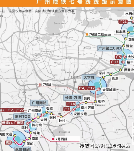 广州地铁 7 号线西延段:项目距离美的大道站步行约 800-900 米,步行时间约 10 分钟,美的大道站为 7 号线终点站,乘坐 7 号线 7 站直达广州南站,全程约 25 分钟,换乘广州地铁 2 号线、18 号线等线路,可快速通达广州珠江新城、番禺、海珠、天河等核心区域。